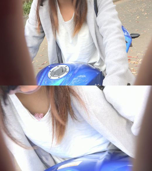 作品名:【乳首チラ】vol.42 僕の愛車に跨いで興奮する友人の胸元から突然現れたぷっくり乳首【胸チラ・浮きブラ】